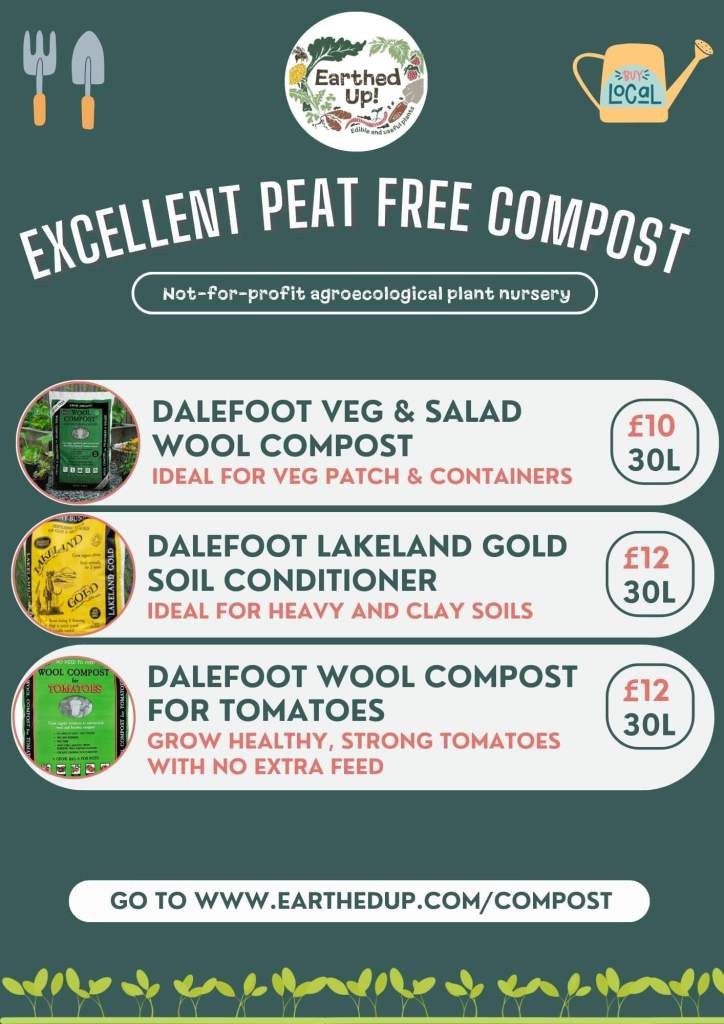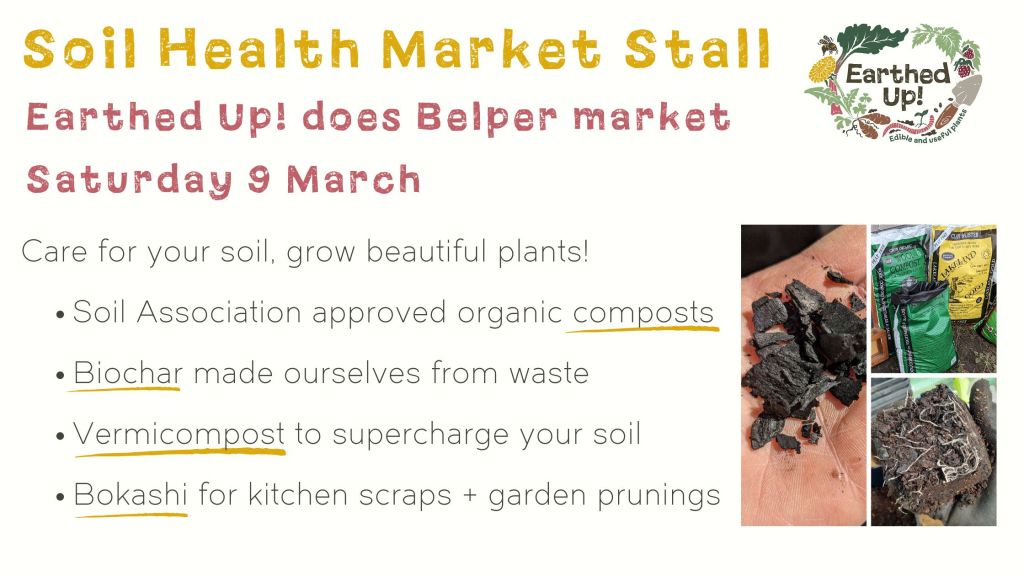 On Saturday 9th March we will be at Belper Market 8.30am – 1pm with a stall selling all things soil health! We will have Dalefoot Wool Compost for Veg and Salad, Dalefoot Lakeland Gold Soil Conditioner, Dalefoot Wool Compost for Tomatoes. We will also have biochar which we made ourselves, vermicompost which is packed full of beneficial microbes who do all the soil improvements for you and also bokashi which is a really easy way to compost your kitchen waste and turn into a soil improver within just a few weeks. We will also have gift vouchers for Mother’s Day if you want to give the gift of a garden consultation!