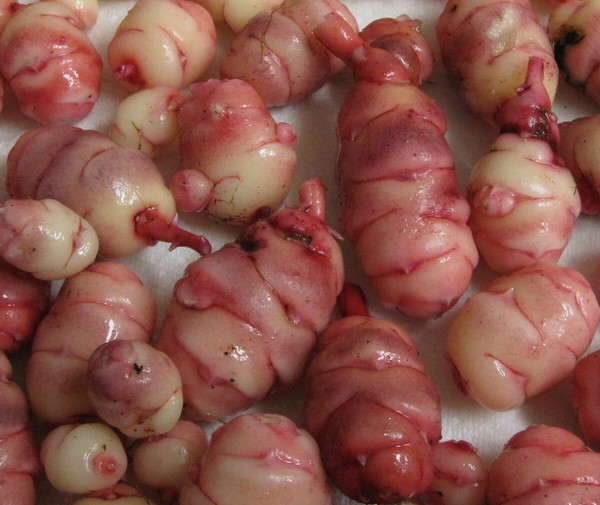 All tubers that are harvested now can be stored for weeks, perhaps through the winter, dry in a paper bag in the fridge. Or, in dry compost or sawdust in the cool. Keep them away from where rodents will find and devour them. Check on them every few weeks for signs of rot or roots.