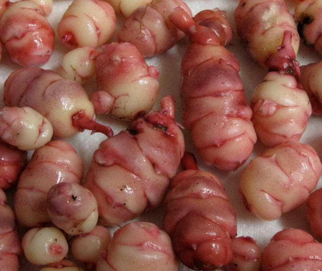 Oca tubers are rare to find outside South America and New Zealand. They are delicious! They taste tangy, sometimes sweet and lemony. They are used as a potato alternative, but can be eaten raw. The edible leaves taste like sour green apples. They are rich in nutrients and easy to grow. They are harvested after a hard frost.