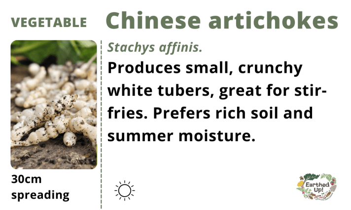 Perennial plant for the small, crunchy edible tubers harvested autumn through to spring. Use like water chestnut in stir fries or just snack on it raw. Looks like a mint, is related to mint, doesn’t smell. Grow in sun or part shade.