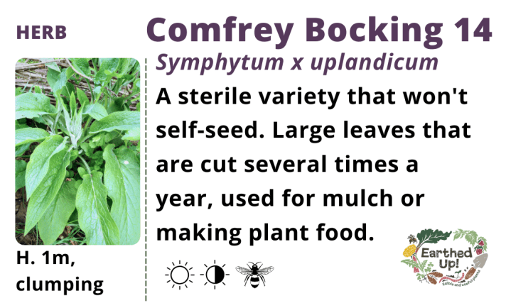 Deep rooting perennial mineral accumulator, high in potassium. Leaves can be cut to make plant feed or added to your compost heap. Can be cut up to 4 times a year if in fertile soil. Left to flower, it provides nectar adored by bees. This variety doesn’t produce viable seed so is propagated by roots.