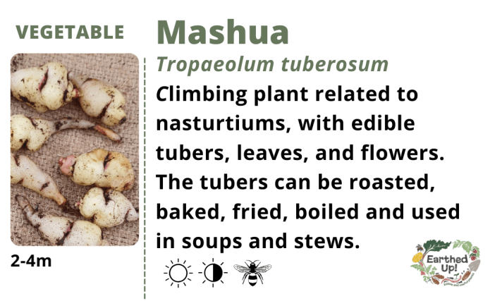 Mashua, Tropaeolum tuberosum, is a perennial cousin of the nasturtium. It comes from the cool, tropical highlands of the Andes, where it is grown as a food crop. You can boil, mash, roast or fry…