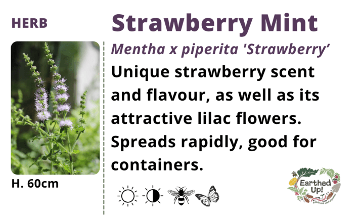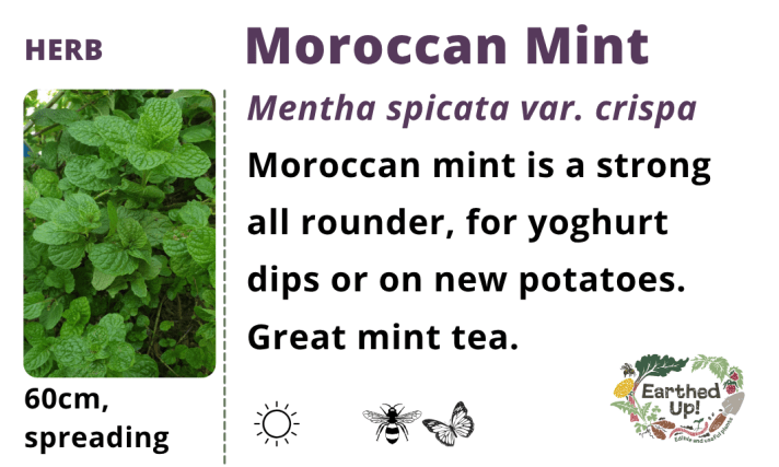 Strawberry mint is delicate, good in salads or summer cocktails. Moroccan is a strong all rounder, for yoghurt dips or on your new potatoes. Peppermint and Bowles make nice teas. Apple mint forms a dense ground cover.