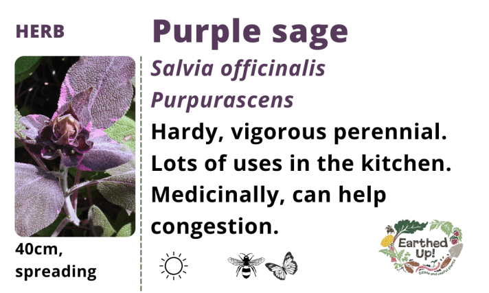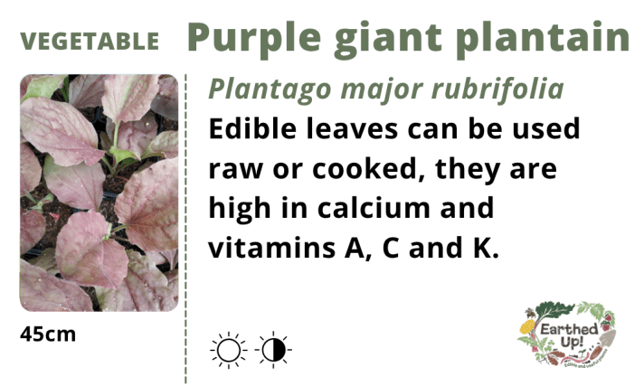 A beautiful purple leaves form of broad leaved plantain. It looks great, grows well, young leaves can be eaten and they are used medicinally on the skin.